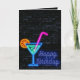 Panneau de cocktail en néon et chapiteau d'anniversaire joyeux brillant sur un mur en brique gris foncé. Le texte intérieur est modifiable.