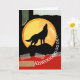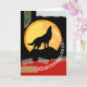 Ahwooo Happy Howl-o-ween avec loup hurlant, pleine lune, et collage d'art look avec papiers déchirés et bande. Bonne carte de voeux Halloween. Copyright © Shoaff Ballanger Studios, 2022.