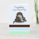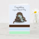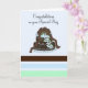 Un joli gâteau au chocolat et au mariage bleu avec un gros arc chocolat brun avec des pois blancs et de jolies fleurs bleues en cascade. Trois bandes de couleurs coordonnées accentuent le fond. Customisez l'intérieur avec votre propre message ou laissez tel quel.