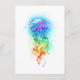 Grande méduse irisée, artistiquement dessinée, brillante, avec de longues tentacules sur le blanc, peinte sur l'arrière - plan multicolore. Méduse arc-en-ciel.