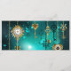 Or, clés antiques avec engrenages et cadrans accrochés sur chaînes dorées sur arrière - plan vert lumineux.
