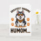 This card features a cheerful, stylized black-and-white dog with pointed ears and a fluffy tail, standing front and center with an open-mouthed grin and soft pink cheeks that feel like a friendly flirt ❤️. The dog wears orange-framed sunglasses with a dotted pattern and a matching bandana, giving it a confident look that still reads tender and affectionate. Curved text wraps around the character in big black letters with an orange shadow, reading “GREATEST DOGGONE HUMOM...” to keep the message light and adoring. The words sit prominently near the top and around the figure, making the compliment the first thing you notice. Four orange paw prints are placed evenly around the design, adding a rhythmic, upbeat touch 🌼. The background stays plain white, so the warm oranges and yellows pop against the dog’s monochrome coat. The overall style is graphic and smooth, with crisp edges and simple shapes that keep the focus on the dog’s beaming face. The orange paw prints appear near the corners, framing the dog against the white space.