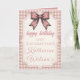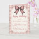This Coquette Pink Bow & Gingham Sweet 16 Card is a stylish and feminine choice for a milestone celebration. The design centers around a large, vintage-style hand-drawn pink bow that perfectly captures the popular "coquette" aesthetic.
