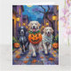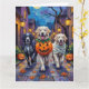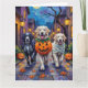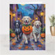 Adorable Grand Pyrénées habillées de costumes d'Halloween ludiques portent des seaux citrouilles tout en trompant ou en traitant sous le ciel illuminé par la lune. Ce design festif met en valeur le manteau blanc moelleux de la race, les yeux calmes et la douce personnalité géante, capturant parfaitement l'atmosphère éffrayante et amusante de la nuit d'Halloween. Une célébration magique pour les amoureux de les chiens comme pour les fans d'Halloween.