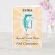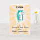 Félicitez votre grande nièce spéciale lorsqu'elle fait sa première communion. Cette carte célèbre avec un soleil doré éclatant avec une coupe, une hostie et du blé au centre de couleur sarcelle. Personnalisez avec son nom pour un souvenir vraiment personnel en ce jour saint.
