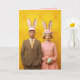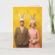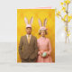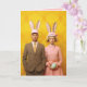 Un homme et une femme rétro avec une expression sérieuse du visage, portant des oreilles de lapin sur la tête et elle tient des oeufs de pâques de couleur pastel