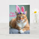 Cette carte représente un chat roux tabby qui regarde vers l'avant avec des yeux vert doré qui semblent rencontrer les vôtres avec une attention amicale, presque aguicheuse 🐇. Des oreilles de lapin rose pâle sont posées sur sa tête, et une petite couronne de fleurs blanches et violettes avec des feuilles vertes ajoute une touche douce et printanière 🌷. Le chat est allongé sur une surface en tissu gris atténué, les pattes avant croisées, ce qui donne à la pose un air calme et convivial, comme s'il attendait à côté de quelqu'un qu'il aime. Un éclairage chaud et doux met en valeur la robe orange et les rayures plus foncées tout en éclaircissant la poitrine blanche et les fines moustaches. À l'arrière-plan, la scène se fond dans un flou lisse, de sorte que le chat reste clairement au centre de l'attention. Une ligne de texte rose joyeuse est placée sur l'image, se détachant