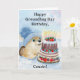 This hand-painted watercolor and pen illustration features a cute groundhog peeking out of his den as he reaches for a chocolate and vanilla cake topped with strawberries, blueberries, and boysenberries. A funny card for a cousin!