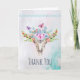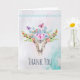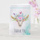 Carte de remerciements avec un arrière - plan turquoise et pastel aquarelle. Un crâne animal chic boho avec un bouquet floral sur la tête et des petits papillons qui fleurissent. Une jolie bordure décorative aux petites teardrop en bleu clair. Message personnalisé à l'intérieur.
