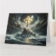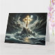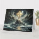 Une scène dramatique religieuse chrétienne avec une croix dorée sur une mer orageuse.