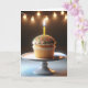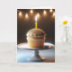 Un seul cupcake avec des arrosages colorés et une bougie éclairée repose sur un piédestal blanc contre un arrière - plan sombre Tout le texte peut être changé.