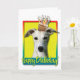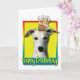 Célébrez un anniversaire avec cette carte de voeux fantaisiste pour chien Whippet. Avec un cupcake équilibré sur sa tête, ce design ne manquera pas d'apporter un sourire et des rires ! BTW, Cette conception a plusieurs versions, avec différentes couleurs arrière - plans. Il y a aussi une invitation à une version Party.