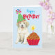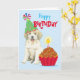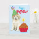 Joyeux salutations d'anniversaire avec ce design mignon avec un joli chiot des Pyrénées avec un cupcake d'anniversaire portant un casquette de fête. Le texte peut être facilement changé; il suffit de cliquer sur le bouton personnaliser.