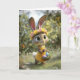 This adorable Easter greeting card features a sweet bunny wearing a cheerful yellow dress and a colorful flower crown while carrying a basket of pastel Easter eggs. Surrounded by butterflies and soft spring sunshine, the scene captures the playful magic of Eastertime. Perfect for sending warm holiday wishes to friends, family, or anyone who loves cute bunny art and whimsical spring designs.