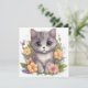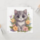 Carte Cute Grey Kitty avec Fleurs Kawaii Chibi