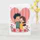 This greeting card shows a joyful scene of young love, centered on a smiling boy and girl standing side by side. The boy has dark spiky hair and wears a green shirt, while the girl has long brown hair and a bright yellow dress. Their happy expressions and rosy cheeks give the scene a warm, cheerful feeling. Behind them is a large striped heart in soft pink and coral tones, stitched together like a symbol of care and devotion. Smaller red and pink hearts float around them, adding energy and affection. Along the bottom, a row of delicate flowers in shades of crimson and pastel pink with green leaves adds beauty and balance. Every detail works together to create a sweet and heartfelt card, perfect for sharing Valentine’s Day love.