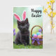 This card shows a small dark-furred kitten sitting on fresh green grass, wearing oversized pink-and-white bunny ears 🐰. Its bright green eyes glance slightly upward, giving it a tender, curious look that feels like it’s waiting for a friendly nuzzle. To the right, a rustic woven basket rests close by, suggesting the kitten has wandered over to keep it company. The basket is filled with smooth pastel eggs in lilac, turquoise, soft orange, and bright green, adding gentle color against the darker fur. A purple ribbon wraps around the basket and ties into a neat bow, like a quiet gift between close friends 🌷. The background fades into soft greens with faint lavender touches, keeping the focus on the kitten and the basket. In the upper right, the words “Happy Easter” appear in black, with the letters floating above the scene.
