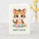 Designed with a sweet, stylized kitten as the main character, shown in caramel and cream tones with gentle tabby stripes. Its large shining eyes catch the light, and the softly blushed cheeks and tiny rosy nose give it a tender, friendly look, as if it’s gazing at someone it trusts. Around the kitten’s paws sit smooth oval eggs in mint green, baby pink, and sky blue, adding a seasonal touch 🌷. The background stays pale with a faint texture, letting the warm fur colors stand out without distraction. Near the bottom, a short Easter greeting appears in solid green lettering, centered and easy to read 🐰. The lines are soft and flowing, and the eggs have small highlights that make them look slightly glossy. A light glow surrounds the kitten, with the green text resting just below the cluster of pastel eggs.