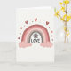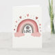 This greeting card features a softly curved rainbow in muted bands of dusty rose, blush pink, warm taupe, and a grounding gray stripe on a white background. Two peach-toned clouds sit at the base of the rainbow, giving the design a cozy, caring feel. Small hearts and tiny dots are scattered around the card in shades of pink and red-brown, adding a sweet touch of affection ❤️. Near the center, the word “LOVE” is printed in simple black block letters, easy to read and calm in style. Just above the word is a small outlined daisy with a light pink center, like a gentle little reminder of kindness. The layout feels balanced and light, with the hearts floating around the main image without taking over. It’s a thoughtful choice for romance, friendship, or a simple “thinking of you” note