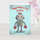 This greeting card shows a friendly gray robot standing against a smooth blue‑green gradient background. The robot has segmented arms and legs, small orange eyes, and a gentle, curious expression that feels sweet and welcoming. Three red hearts rise above its head like little signals of love, adding a fun, affectionate touch ❤️. On its chest there’s a set of four square buttons, including a deep blue heart and a bright red heart that reinforce the Valentine theme. Its hands are red, and there are small red details on its head that tie in with the hearts and the message. Across the top, the text “Happy Valentine’s Day Grandson” appears in red cursive-style lettering, arcing above the robot so it’s the first thing you notice. A soft shadow under the robot helps it feel grounded, like it’s standing in a gentle spotlight. It’s a meaningful card to give because it mixes a cute character with a clear message of family love, making it easy to share Valentine’s Day sentiments 🥰.