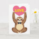 Designed with a cute sloth sitting in the center, this card keeps the focus on a simple message of love. The sloth is warm brown with a light beige belly and darker patches on its arms and legs. It sits cross-legged and lifts both arms to hold up a large pink heart above its head 💘. Inside the heart, the word “LOVE” appears in sunny yellow letters that look thick and easy to read, placed right in the middle. The sloth looks happy, with a wide open smile, rosy cheeks, and dark eyes framed by its usual face markings 😘. A dark blue bow tie at its neck adds a sweet, dressed-up touch. The background is plain white, so the sloth and heart stand out clearly and feel calm and friendly.