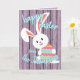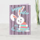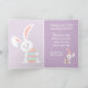 Jolie, tendance et moderne "Happy Easter" police de caractères sur un ressort violet clair perwinkle planches en bois violet à l'air arrière - plan et un lapin lapin mignon au-dessus des planches. Avec de la place pour facilement customiser ou personnaliser avec votre nom de famille et le texte de votre choix sur le devant, et un poème ou un mignon message de salutation personnel à l'intérieur.