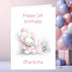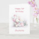 Make her first birthday even more memorable with this delightful teddy bear card. The lovable bear, decorated with cute pink bows, holds a bunch of pink and white balloons while sitting next to a pink birthday cake crowned with one shining candle.
