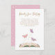 Ces cartes d'enclos simples et mignonnes "Books for Baby" en baby shower présentent un livre d'histoires dessiné à la main avec des papillons rose pastel et violet qui en jaillissent. Les touches d'or faux ajoutent une touche d'élégance. Le dos contient un motif carré esquissé blanc sur un arrière - plan couleur personnalisé (en rose).