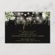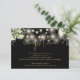 Cette élégante carte de détails noir et or mariage, avec de jolies lampes à cordes et de la verdure fleurie, peut être personnalisée avec vos informations dans la typographie moderne chic. Conçu par Thisisnotme©