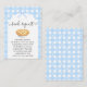 This charming book request enclosure card is designed as an insert to accompany baby shower invitations. It features a cozy illustrated apple pie on a soft blue gingham background with delicate white floral accents and a sweet coquette bow at the top. The elegant script title and rhyming message encourage guests to bring a meaningful book instead of a traditional greeting card, creating a thoughtful keepsake for the parents-to-be. Perfect for dessert-themed or pie-inspired baby showers, this timeless pastel insert can be used for celebrations in any season.