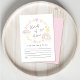 Carte Whimsical boho bébé girl boîtier de douche avec des aquarelles roses et jaunes d'un arc-en-ciel, soleil, coeurs, étoiles, lunes et nuages et "Words of Advice" dans un script élégant.