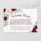 Cette belle carte mariage est une façon de demander à vos invités de l'argent ou de l'argent en guise de cadeaux. L'élégant design présente un magnifique design boho chic rustique avec des lettrages de script élégants et des roses aquarelles peints à la main dans les tons bordeaux, rouge et rose roux. Le titre se lit "Wishing Well" avec un poème mignon : "Tandis que nous commençons notre nouvelle vie en tant que Mr. & Mme Nous avons déjà une maison pleine de plats Mais si vous voulez nous donner un cadeau Un cadeau de quelques espèces serait si agréable! Il y a de l'espace en bas pour une petite note.