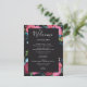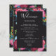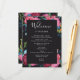 Itinéraire floral mariage en noir avec fleurs en rose, bleu et bordeaux. Écrivez votre itinéraire d'un côté, et une note de remerciement de l'autre.