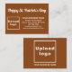 Bonne Saint Patrick’s Day ! Un autre jour férié pour célébrer cette Marche et faire de la publicité pour votre entreprise ou pour promouvoir votre marque. Le vert est toujours la couleur de ce séjour mais essayez aussi d'autres couleurs. Carte couleur enceinte Brown que vous pouvez customiser pour mettre votre marque d'affaires et avec salutation Saint Patrick's Day. Il peut s'agir de la couleur qui correspond à votre schéma de couleurs d'entreprise. Customisez-le et utilisez-le pour accueillir vos clients ou clients cette Saint Patrick’s Day et comme matériel de marketing pour annoncer votre entreprise ou promouvoir votre marque. Vous pouvez également l'utiliser comme accessoire du matériel d'emballage de votre produit. Carte de boîtier personnalisable que vous pouvez utiliser pour développer la sensibilisation de marque. Pour customiser cette carte de boîtier, téléchargez votre logo d'entreprise, tapez votre nom d'entreprise, votre adresse, votre numéro de téléphone, votre adresse électronique et votre site Web ou votre page de médias sociaux professionnels. Veuillez vérifier l'apparence sur les côtés avant et arrière après avoir téléchargé le logo et tapé des textes. Si l'apparence vous plaît, vous pouvez passer votre commande maintenant. Si vous avez besoin de redimensionner et déplacer le logo et les textes pour s'adapter à cette carte de boîtier ou à la taille que vous choisirez, veuillez modifier l'outil de conception. Vous pouvez également modifier la couleur arrière - plan, la couleur de police et le style de police dans l'outil de conception. Je vous souhaite le meilleur de la chance, de la joie et plus de ventes ce jour férié.