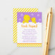 Cette carte de demande de livre mignonne et amusante comprend un adorable canard jaune et canard en bulles de bain savonneuses blanches sur un arrière - plan violet clair avec un ruban orange et des rayures jaunes. Le texte combine écriture manuscrite et polices sans serif pour un look élégant et moderne. C'est parfait pour un Baby shower.