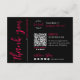 Hot Pink minimaliste et moderne Script QR Code Carte de remerciements pour entreprises Ajoutez ce carte de remerciements élégant à vos commandes client pour une touche chaleureuse. Montrez votre appréciation et égayez votre emballage avec un design de lettrage moderne, rose chaud, noir, blanc et noir. Personnalisez-le en incluant un code de coupon spécial pour encourager les achats répétés. Ajoutez votre logo et vos profils de réseaux sociaux pour aider les clients à rester connectés. Inclure votre lien de site Web dans le code QR pour un accès facile. Contribuez à établir de solides relations avec les clients et à rendre votre marque mémorable.