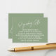 Ces inserts de carte simples et distinctifs ont été conçus pour correspondre à d'autres éléments dans une suite événementielle en pleine croissance qui comprend une police d'écriture décontractée moderne sur un arrière - plan simple que vous pouvez changer à n'importe quelle couleur que vous voulez. Sur le côté avant vous lisez "Concernant les cadeaux" dans le type présenté; sur le dos, j'ai placé une correspondance "Amour et Merci". Le type modifiable est rendu dans une police serif entièrement casquette. Mon message porte-monnaie dit : "La chose la plus importante est de vous avoir avec nous lors de notre journée spéciale. Aucun cadeau n'est nécessaire ou attendu, mais on nous a demandé ce dont nous avions besoin ou ce que nous voulions. Si vous souhaitez nous donner quelque chose, un peu d'argent à dépenser pour notre lune de miel serait très apprécié. "N'hésitez pas à utiliser les champs du modèle et à modifier cette copie avec votre propre message personnel pour faire de ces cartes votre propre carte. // 151 //