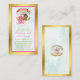 Sirène de bébé dormant dans une coquille de palourde dorée entourée de perles. Nageoire à queue rose et tiare dorée et rose. Sur la banderole on peut lire "Precious". Arrière - plan de menthe.