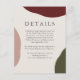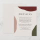 Une carte de détails de mariage simple, élégante et artistiquement stylisée pour fournir à vos invités de mariage tous les détails importants entourant votre grand jour. Ce design présente une riche palette de couleurs automnales avec des formes abstraites de rouge vin bordeaux, de terre cuite et de vert chasseur le long des bords du design. Un fond écru se marie bien avec les couleurs de l'automne. Des combinaisons de typographies élégantes sont utilisées pour transmettre vos détails de mariage dans un beau style. Personnalisez le modèle de texte avec le texte souhaité.