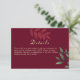 Partagez des informations importantes avec vos invités à l'aide de cette élégante carte de détails mariages de automne. Conçue avec un arrière - plan bordeaux profond, des accents verts et un script d'or classique, cette carte est parfaite pour les mariages d'automne et d'hiver. Utilisez-le pour inclure les itinéraires, les logements, les détails de la réception, le site Web de la RSVP ou toute autre information mariage que vous aimeriez connaître à vos invités. Coordonnée avec les invitations assorties, les cartes RSVP et la signalisation pour une suite complète de papeterie mariage bordeaux et navy. Vous avez besoin d'aide pour la personnalisation ? Contactez-moi - Je suis heureux de vous aider !
