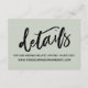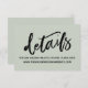 Gardez vos invités de mariage dans la boucle avec tous vos détails en utilisant ces jolies cartes d'insertion de mariage modernes. Un texte en surimpression décontracté a été conçu en utilisant une police manuscrite décontractée en noir, indiquant simplement "détails". Utilisez les champs du modèle pour personnaliser ces cartes avec vos informations personnelles. La couleur de fond peut être changée en n'importe quelle couleur de votre palette de mariage que vous choisissez; tout le texte modifiable apparaît en noir. // 100 //