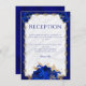 Fournissez des détails importants sur votre réception de mariage, avec cette élégante carte d'encaissement d'invitation, avec un cadre en figuier doré encadrant du satin blanc doux, couronné de roses bleus. L'arrière - plan métallique bleu royal simulé renforce la sensation luxueuse.