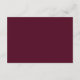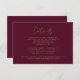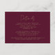 Cette élégante carte de détails mariage moderne comporte du texte doré sur un arrière - plan bordeaux. Le titre apparaît dans un magnifique script d'écriture manuscrite, avec texte personnalisable ci-dessous dans la police sans serif. L'envers est bourgogne solide.