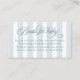 Les élégantes cartes rayées bleues et blanches "Books for Baby" apportent une touche de charme et de sentimentalité à tout baby shower garçon, encourageant les clients à apporter un livre précieux à la place d'une carte de voeux. Doté de bandes verticales bleu pastel douces avec un arrière - plan blanc immaculé, le design est élevé par un script gracieux pour la tête et le texte serif propre pour le poème sincère. Le doux rime invitation les invités à inscrire un message personnel à l’intérieur de leur livre choisi, créant un souvenir significatif pour la bibliothèque du petit. Parfait pour coordonner avec les invitations assorties, cartes de remerciements et autres papeterie de baby shower garçon pour un thème d'événement cohésif et élégant.