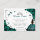 Emerald green, silver and white Quinceanera reception details enclosure cards. Features brunette girl in ball gown dress, script font, silver butterflies, dark green roses and tiara. Perfect for an elegant princess style glam celebration. Personalize with your own details.