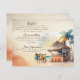 Cartes d'enclosure de mariage élégantes à l'aquarelle dans des tons vintage sombres avec des personnes, une cabane à bar et un palmier.