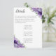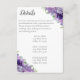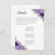 Cette carte d'informations sur les détails du mariage comporte de belles fleurs aquarelles aux nuances de lavande, de lilas et de violet foncé. Elle présente un magnifique bouquet violet et de la verdure pour définir le ton de votre mariage. La couleur de fond est modifiable et nous proposons également des éléments assortis pour créer une suite de mariage complète. Consultez notre site web pour une liste complète de notre papeterie : www.invitefruition.com Suivez-nous sur les réseaux sociaux pour des remises spéciales et de nouvelles sorties de produits : Facebook : www.facebook.com/MagazineInvitation Instagram : instagram.com/invitefruition