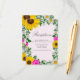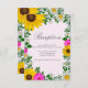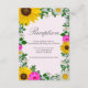Invitation mariage campagnard rustique avec des tournesols vibrants, des marguerites blanches traditionnelles et des fleurs roses contre un arrière - plan rose clair avec l'haleine de bébé et des accents de verdure botanique