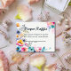 Cette carte de tombola à couches magnifiquement conçue présente des fleurs sauvages d'aquarelle en gras aux couleurs vives du printemps, ce qui en fait l'ajout parfait à un thème de baby shower florissant. Avec ses élégantes oeuvres d'art florales et son agencement simple, il invite les clients à participer à un jeu de tombola amusant tout en ajoutant une touche de charme parisien et d'élégance botanique à la fête.