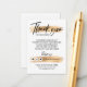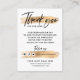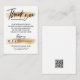 Faites glisser ces cartes de luxe dans votre commande pour dire un merci supplémentaire à votre client et donner une impression professionnelle à votre petite entreprise ou boutique. Une bonne note de remerciement au client pour l'achat ne sera pas seulement apprécier leur confiance en vous, mais les rapportera pour plus ! Cette conception comporte un noir "merci" en caractères manuscrits en gras contre un trait de faux or (effet imprimé). Comprend trois icônes de médias sociaux (amovibles) et un champ pour votre nom d'utilisateur, contact et message personnel avec code de réduction. Vous pouvez facilement ajouter votre CODE QR au dos.